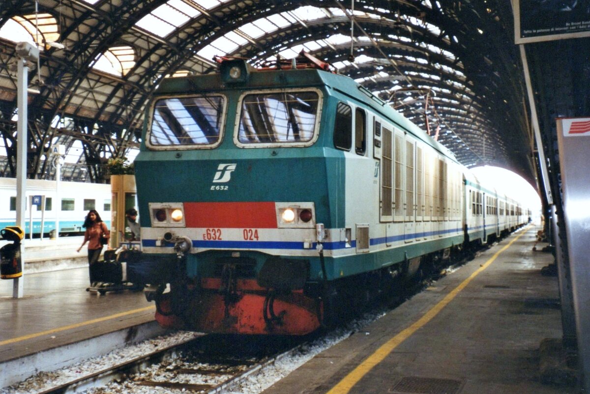 E 632 024 in grüner Testanstrich steht am 17 Juni 2001 in Milano Centrale.