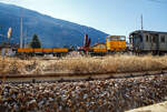 Der Italienische Rottenkraftwagen mit Kran/ Motocarrello di servizio con gru a bracci, F D AGR MI 5161 V (ähnlich einem Klv 53 der DB) mit dem zweiachsigem Gleiskraftwagenanhänger WD CRR MI 0098 L abgestellt am 19 Februar 2017 in Tirano, leider hier im Gegenlicht. Rechts der Steuerwagen FS pBz 623 327 zu den Triebwagen der Baureihen E.623 (Automotrice elettrica E.623 - Rimorchi pBz 623).