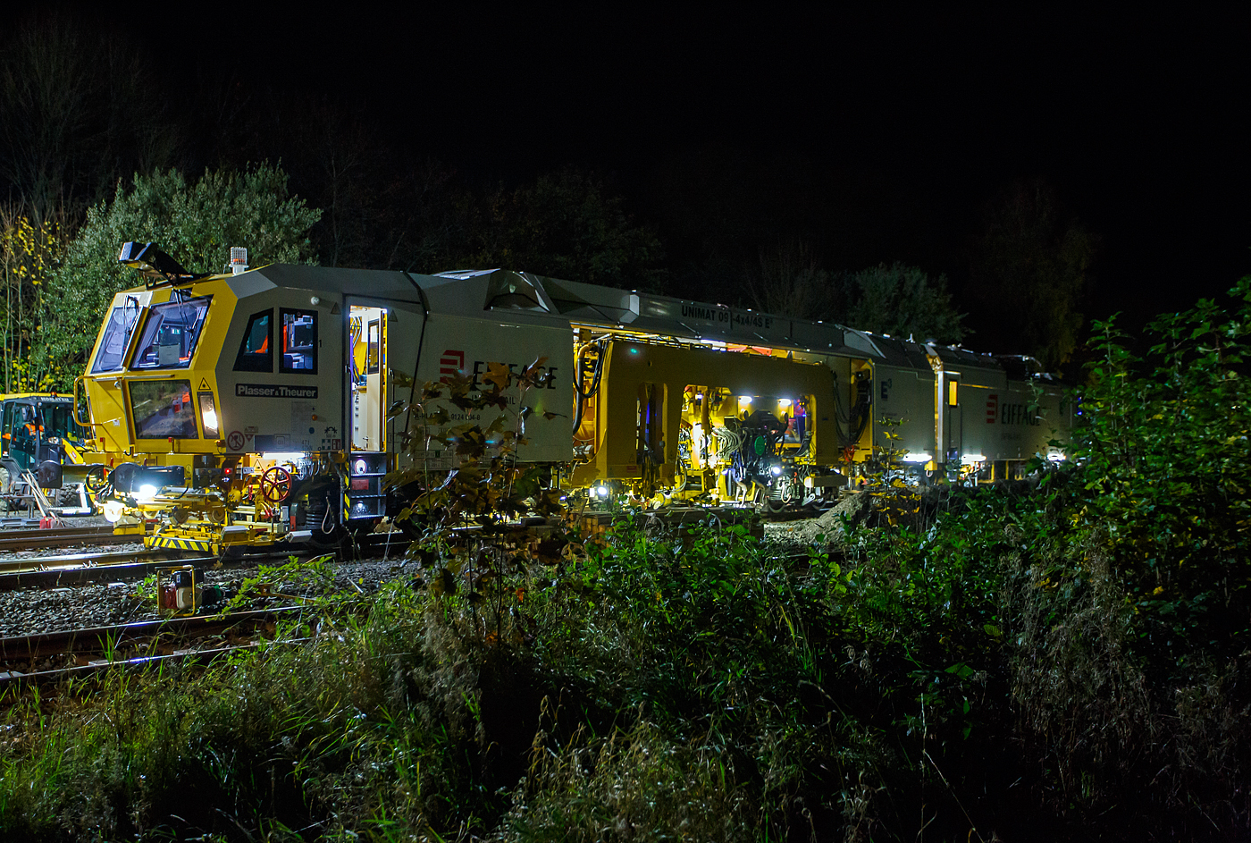Die Baustelle Bahnhof Herdorf am Abend des 26 Oktober 2025, nun ab 20:40 Uhr wird die neue Weiche 3, beim Bahnhof/Stellwerk Herdorf Fahrdienstleiter (Hf), gestopft. Hier kam die recht neue Plasser & Theurer UNIMAT 09-4x4/4S E³ (A-PLA 99 81 9124 004-8), eine Universal-Weichenstopfmaschine mit Hybrid-Antriebstechnik, der Firma Eiffage Infra-Rail GmbH (Herne) zum Einsatz. Ob die Maschine nur von Eiffage Infra-Rail gemietet oder nun gekaut wurde ist mir nicht klar, aber eingestellt ist sie in Österreich über Franz Plasser Vermietung von Bahnbaumaschinen GmbH.